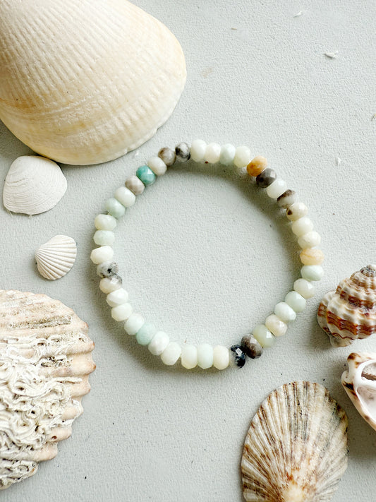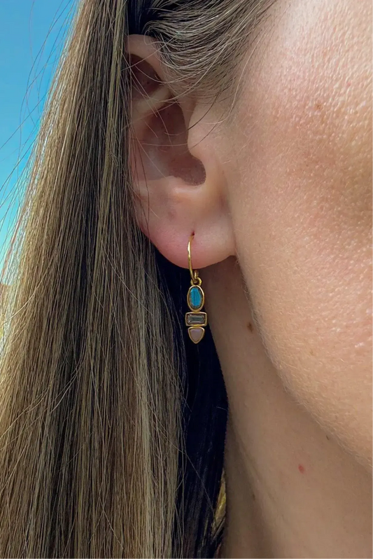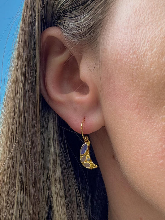 Auskarai su labradorito, dūminio kvarco ir persikinio mėnulio akmens kristalais