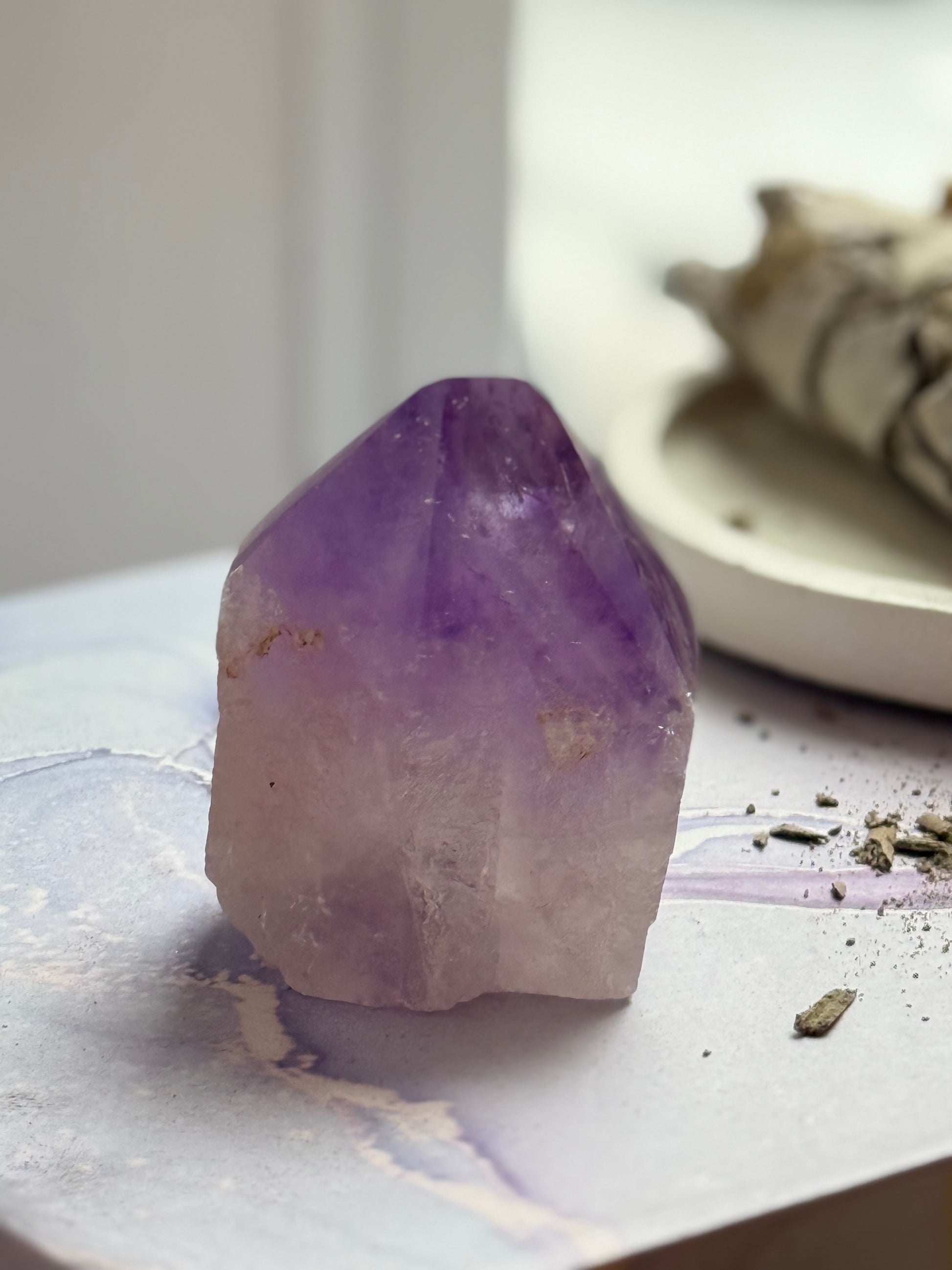 Ametistas - harmonizuoja, suteikia gyvenimo balansą, dvasinį pakylėjimą. Ametistas atblokuoja karūnos čakrą ir padeda dvasiai visiškai įkūnyti į materiją, suderintą su vidine sielos tiesa. Jis taip pat suteikia stiprią apsaugą, vidinę balansą ir harmoniją. Tai akmuo nešantis ramybę, gerinantis miegą, todėl tinka pasistatyti miegamajame. Ametistas apsaugo nuo nužiūrėjimo, nelaimių.