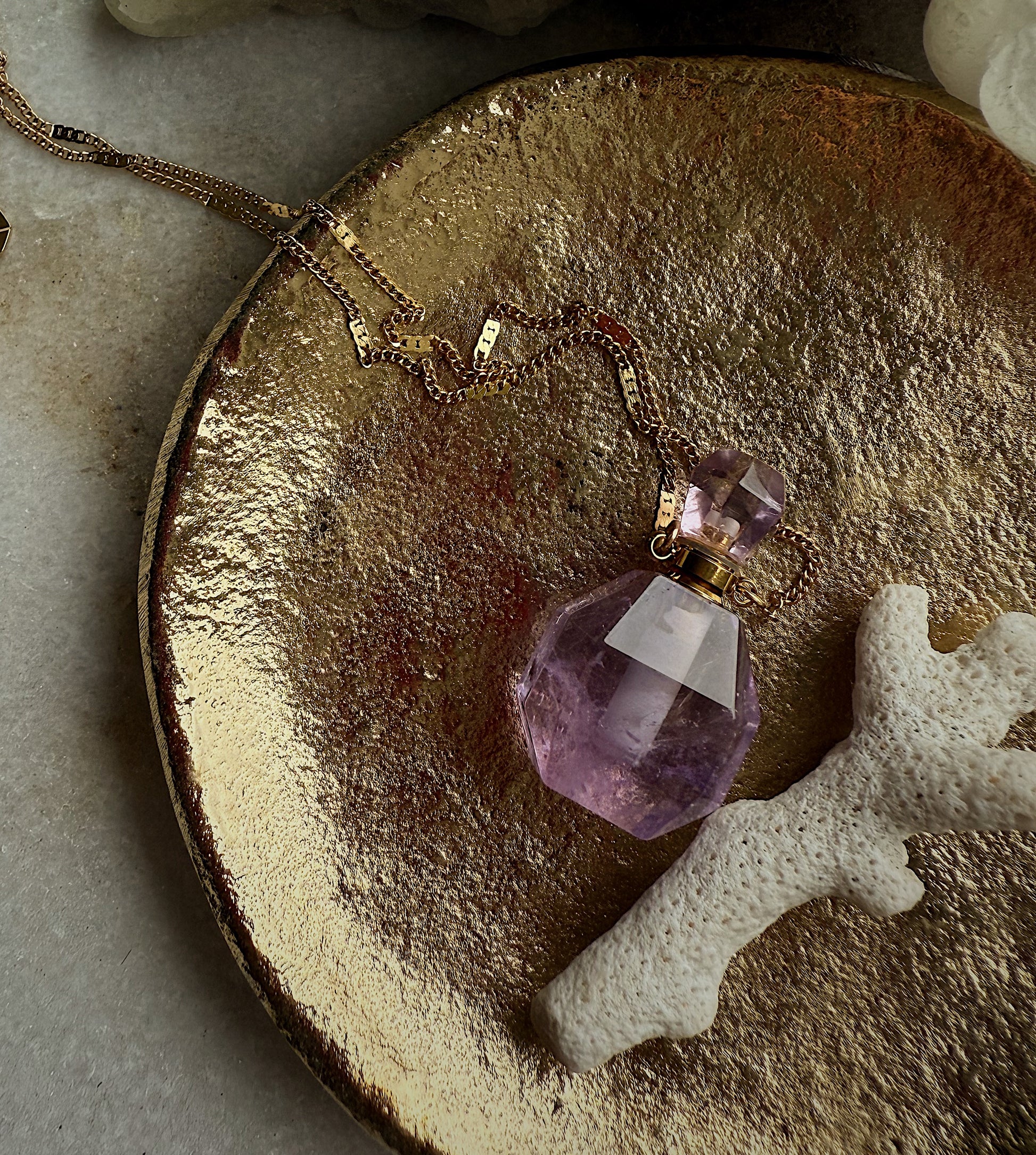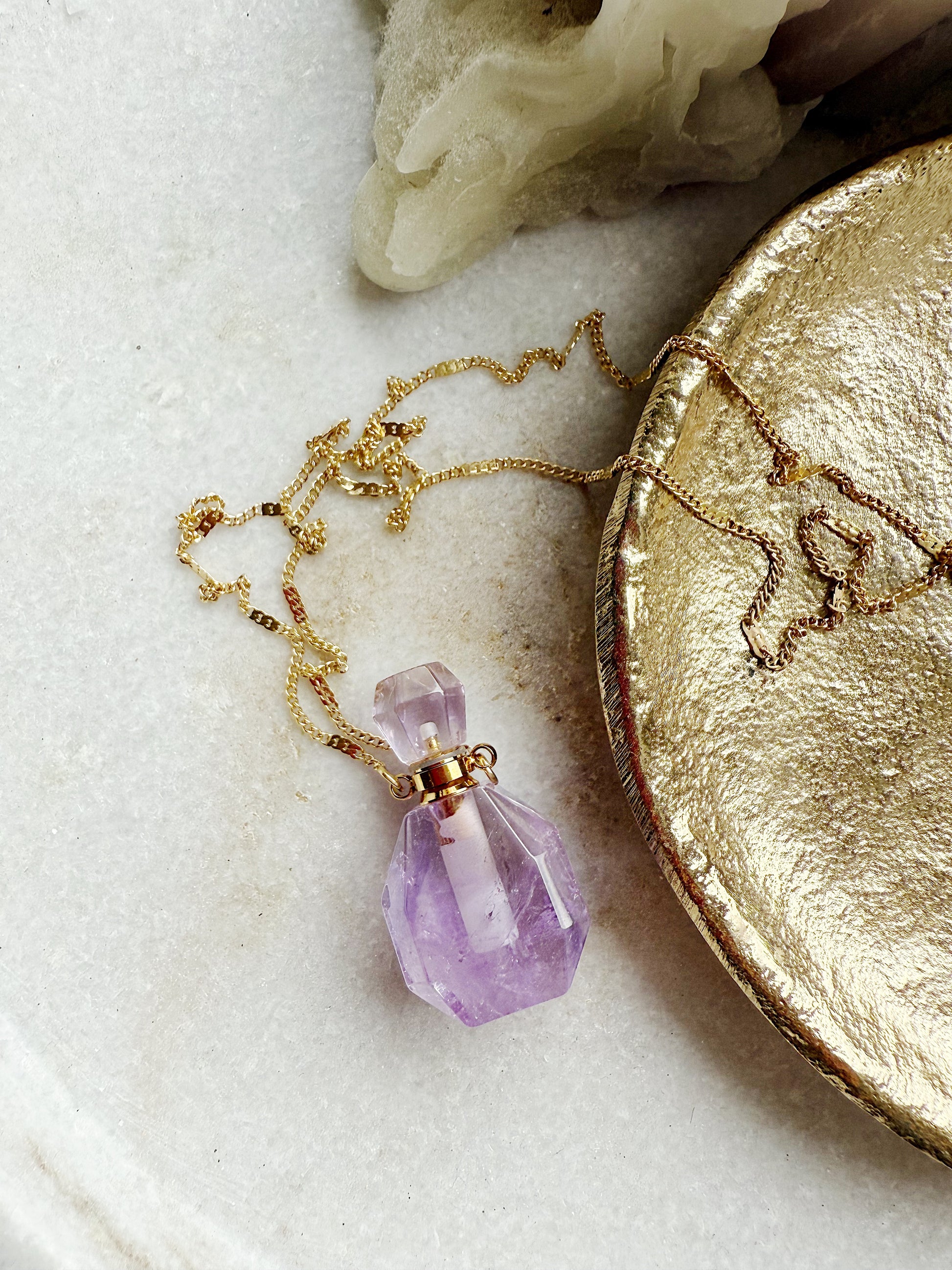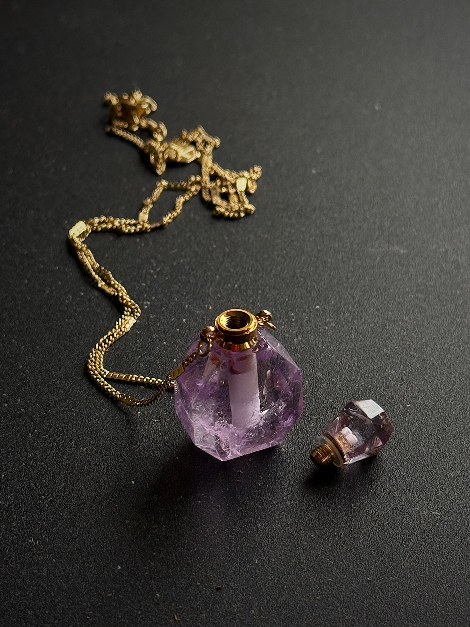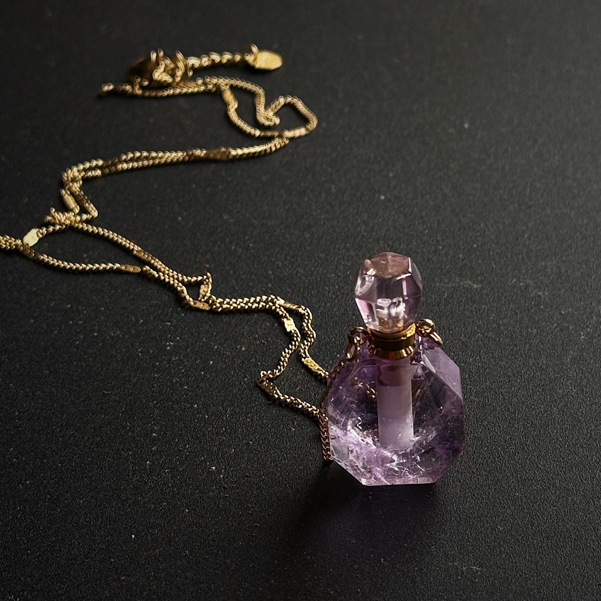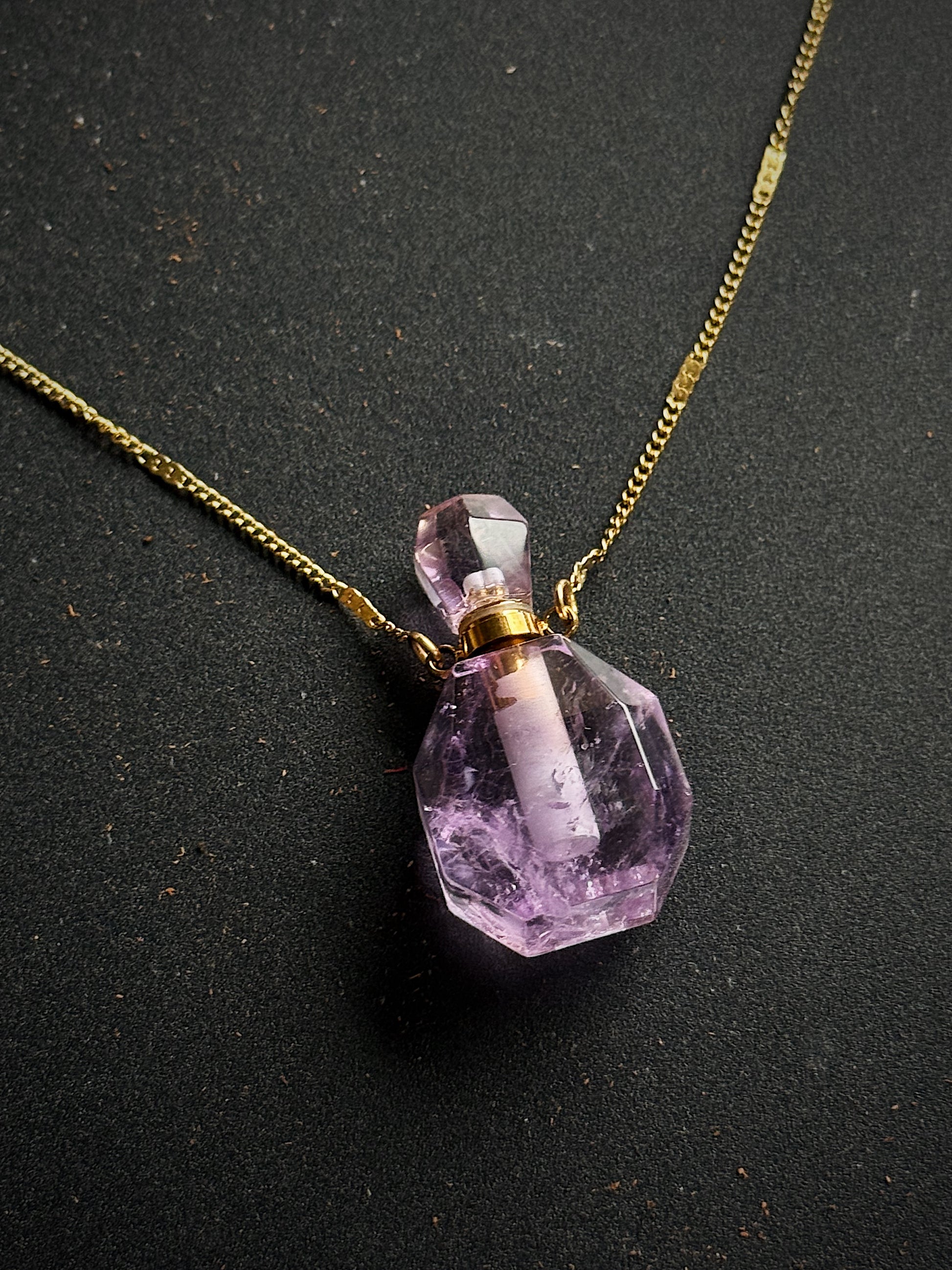 Unikalus kaklo papuošalas su mažu ametisto buteliuku, kuriame galėsite talpinti eterinį aliejų ar mėgstamus kvepalus. Taip primena senovinius, paslaptingus magiškus eliksyrų buteliukus.