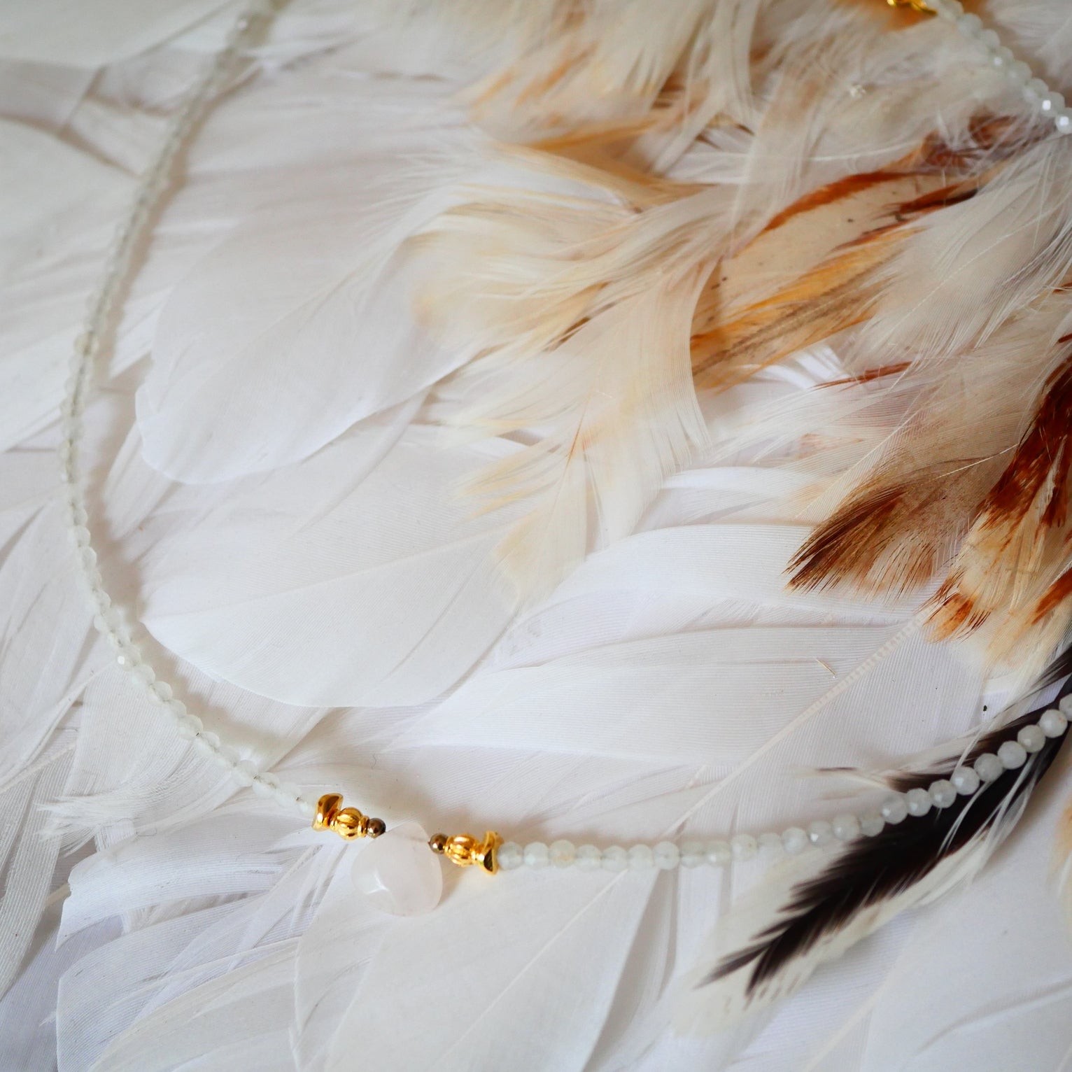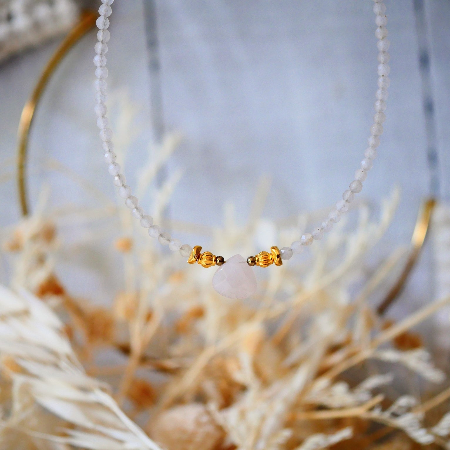 Subtilus mėnulio akmens kaklo vėrinys su Rožinio kvarco pakabuku.