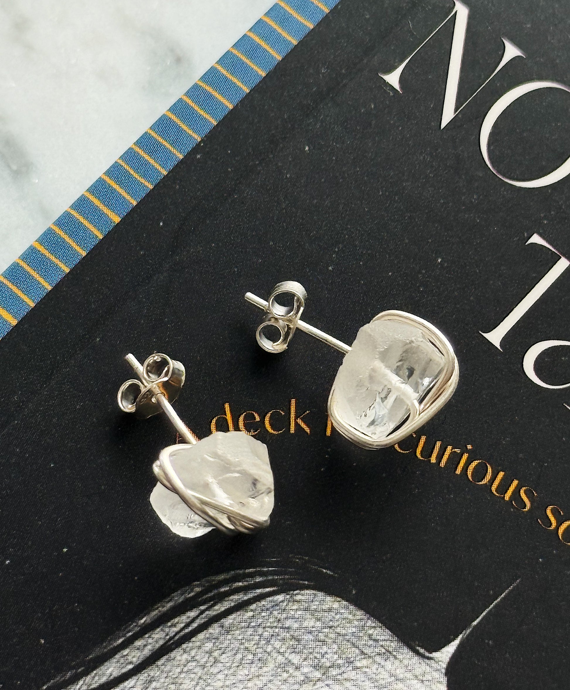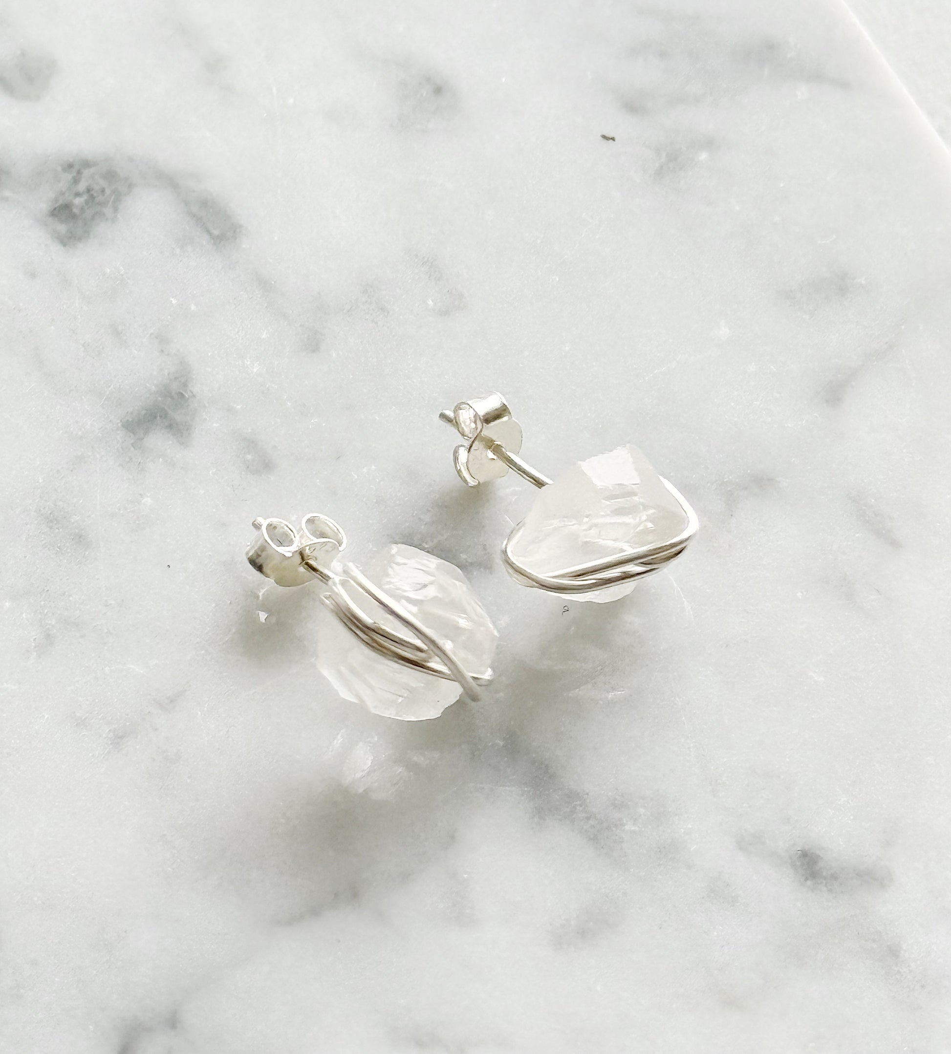Subtilūs sidabriniai auskarai, puošti natūraliais, minimaliai apdirbtais kalnų krištolo kristalais.