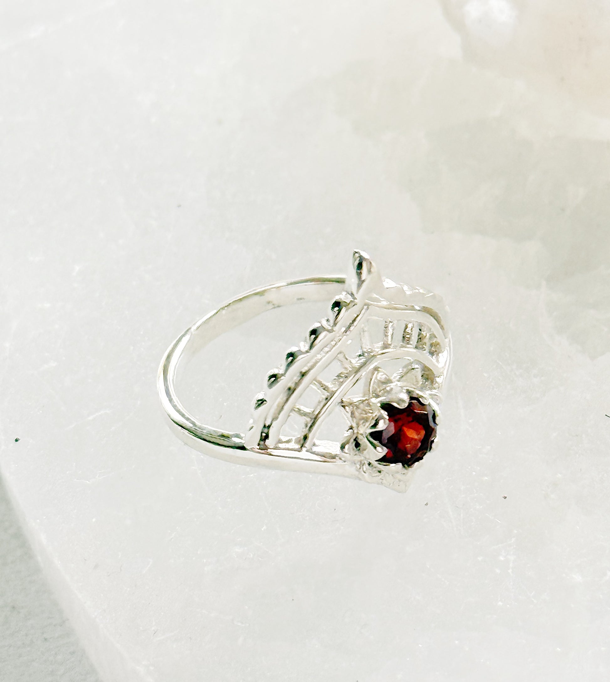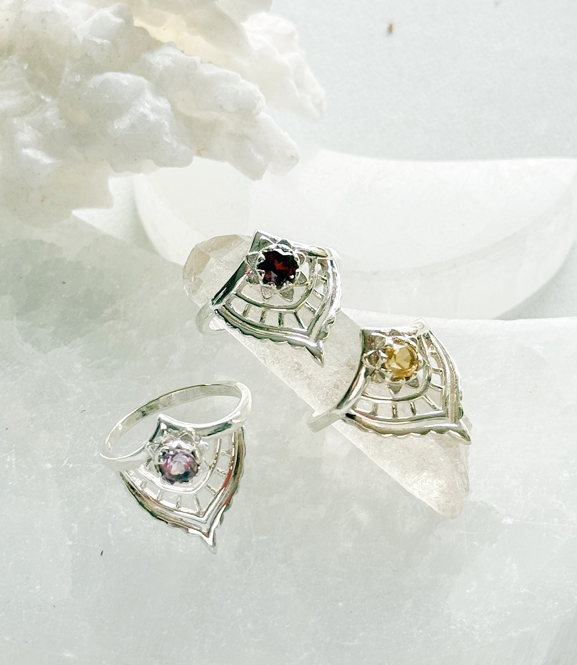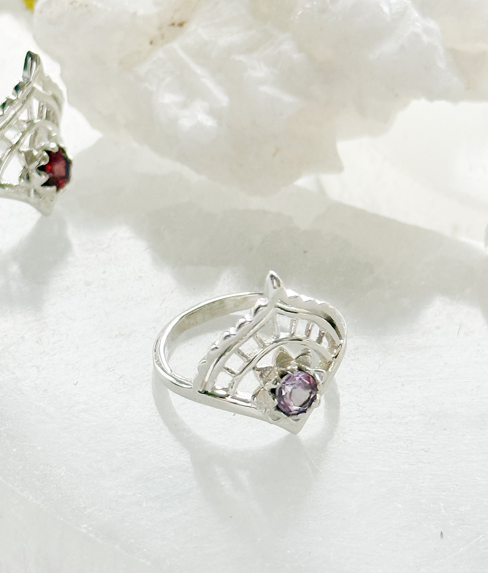 • Žiedas puoštas ametisto, citrino arba granato kristalu.