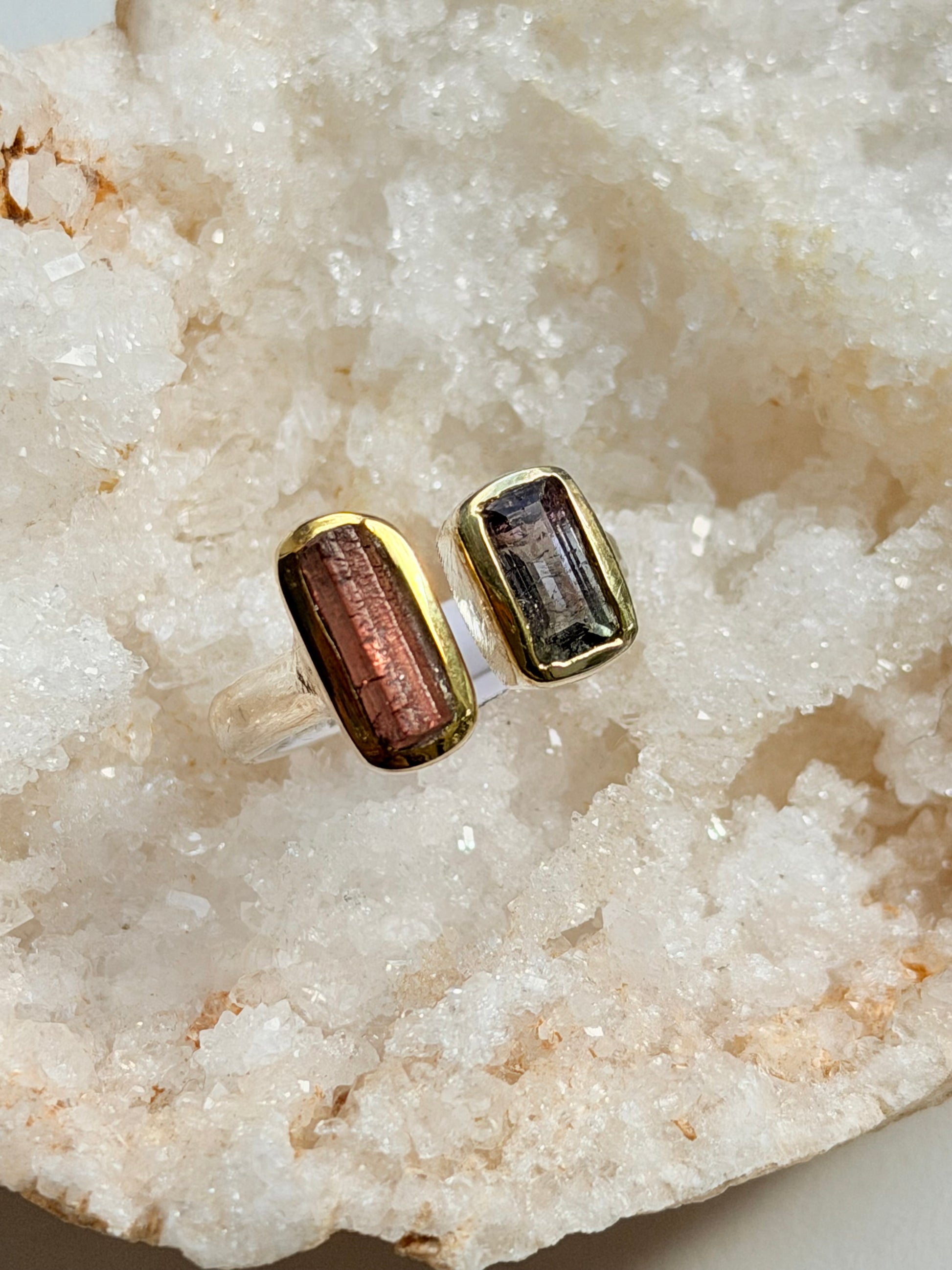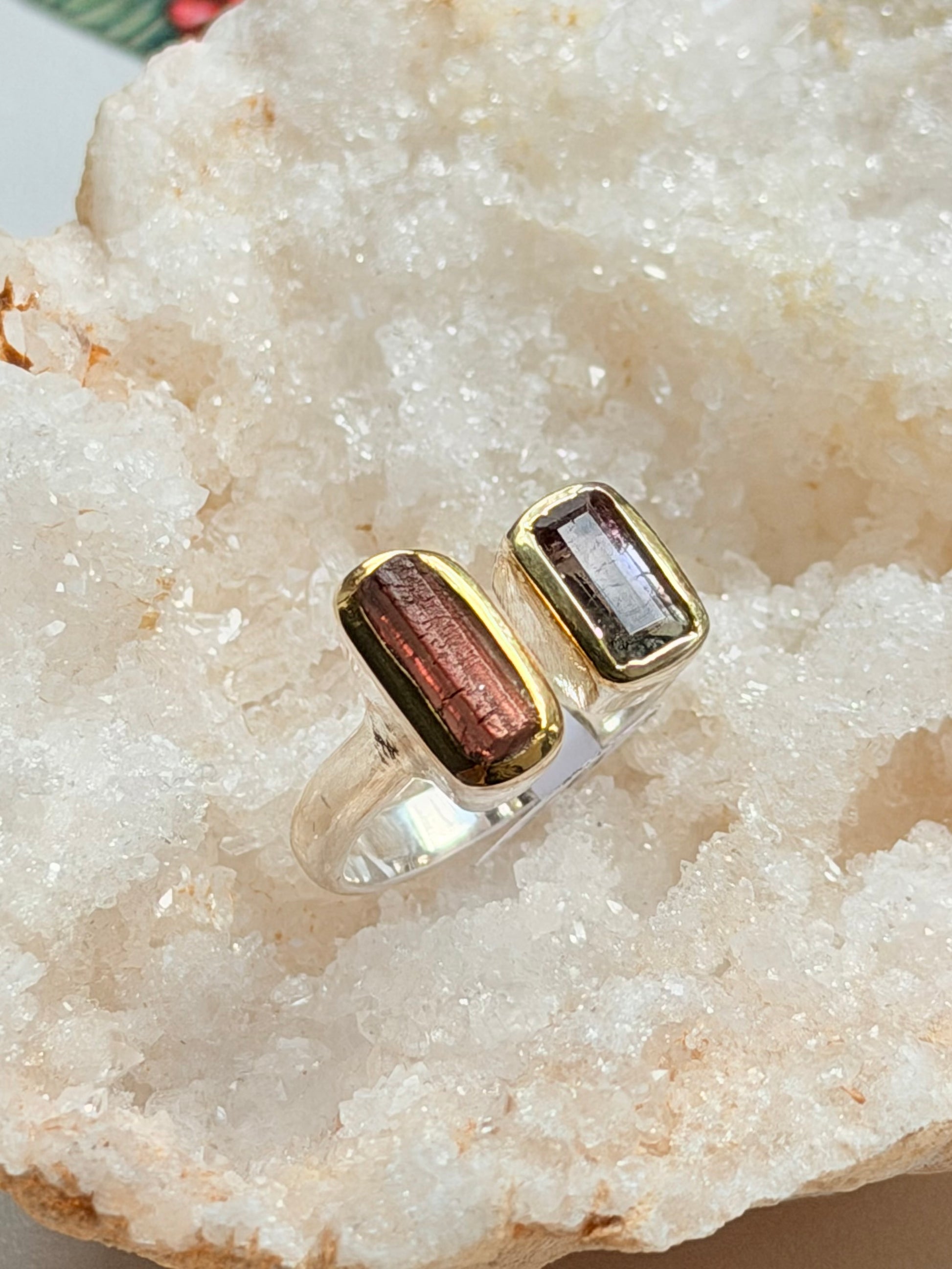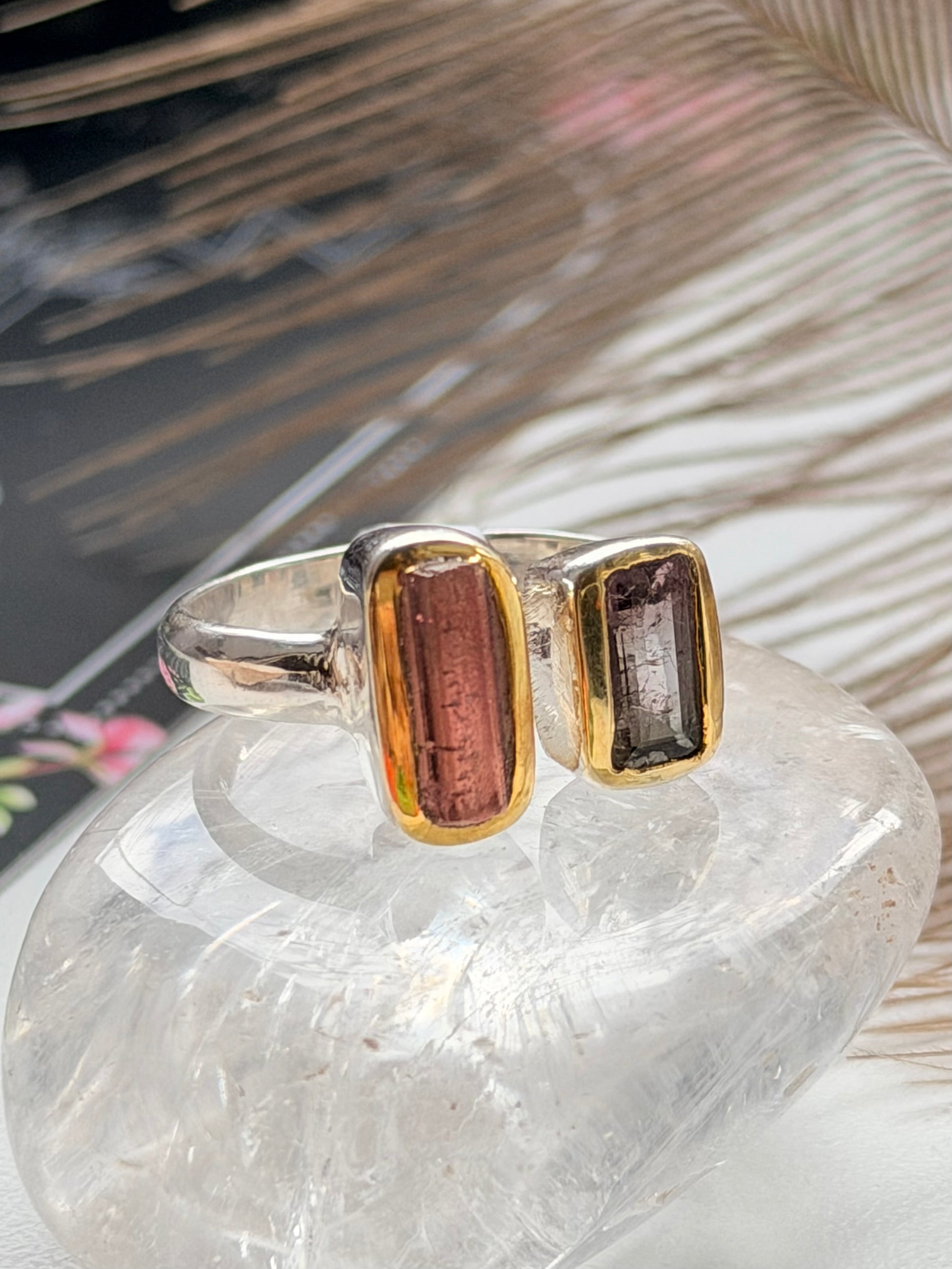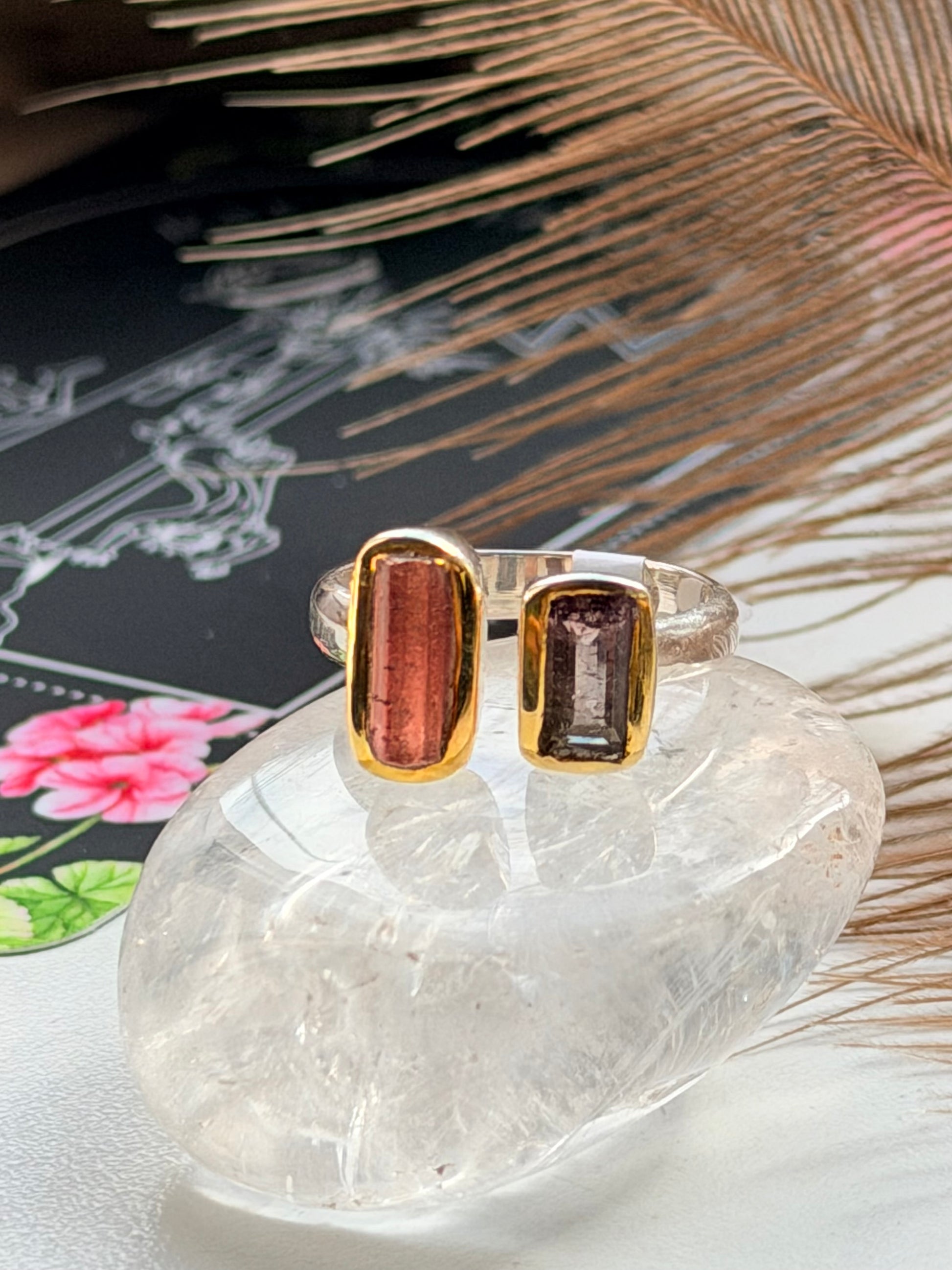 Vienetinis žiedas puoštas arbūzinio turmalino kristalu. Šis akmuo nuo seno žavėjo žmones dėl unikalaus spalvų derinio: žalios ir rožinės.