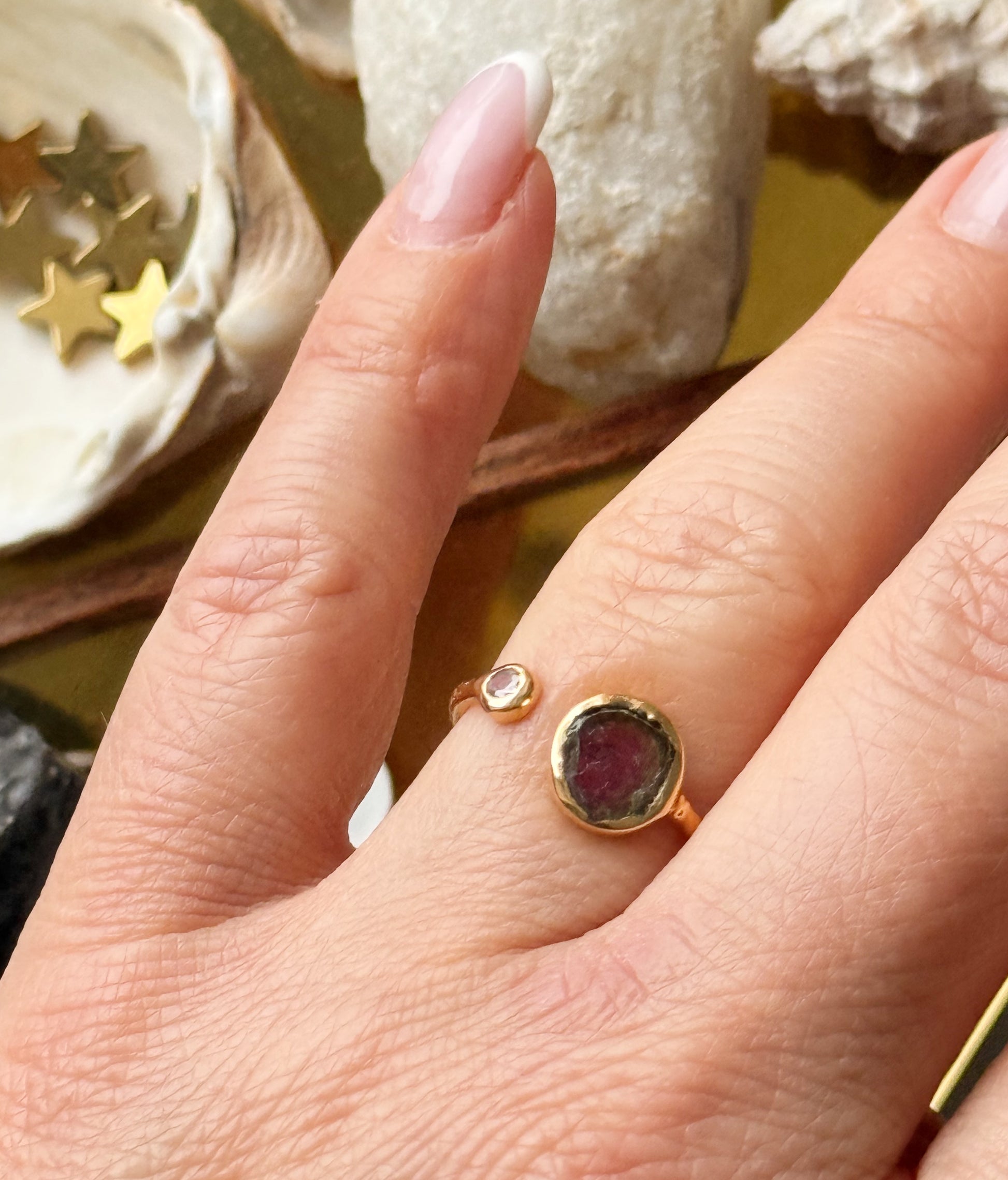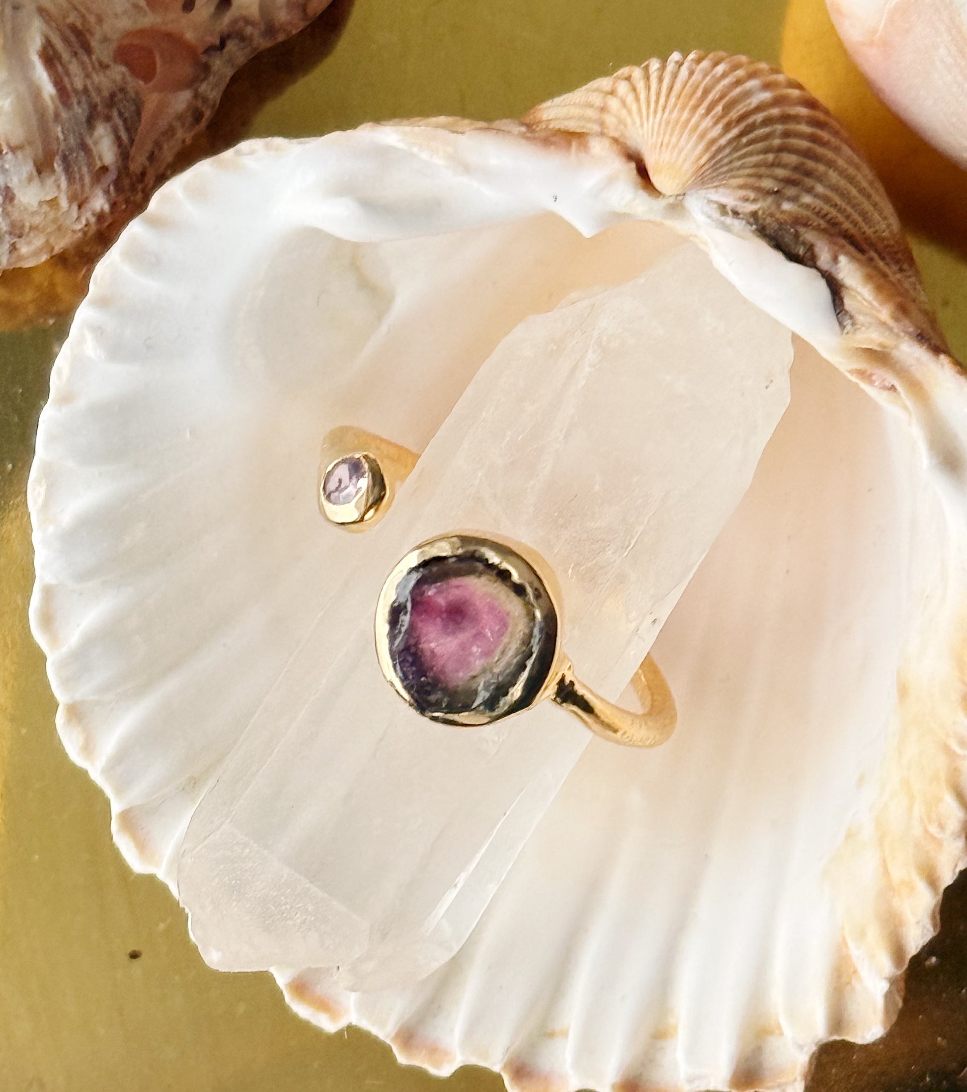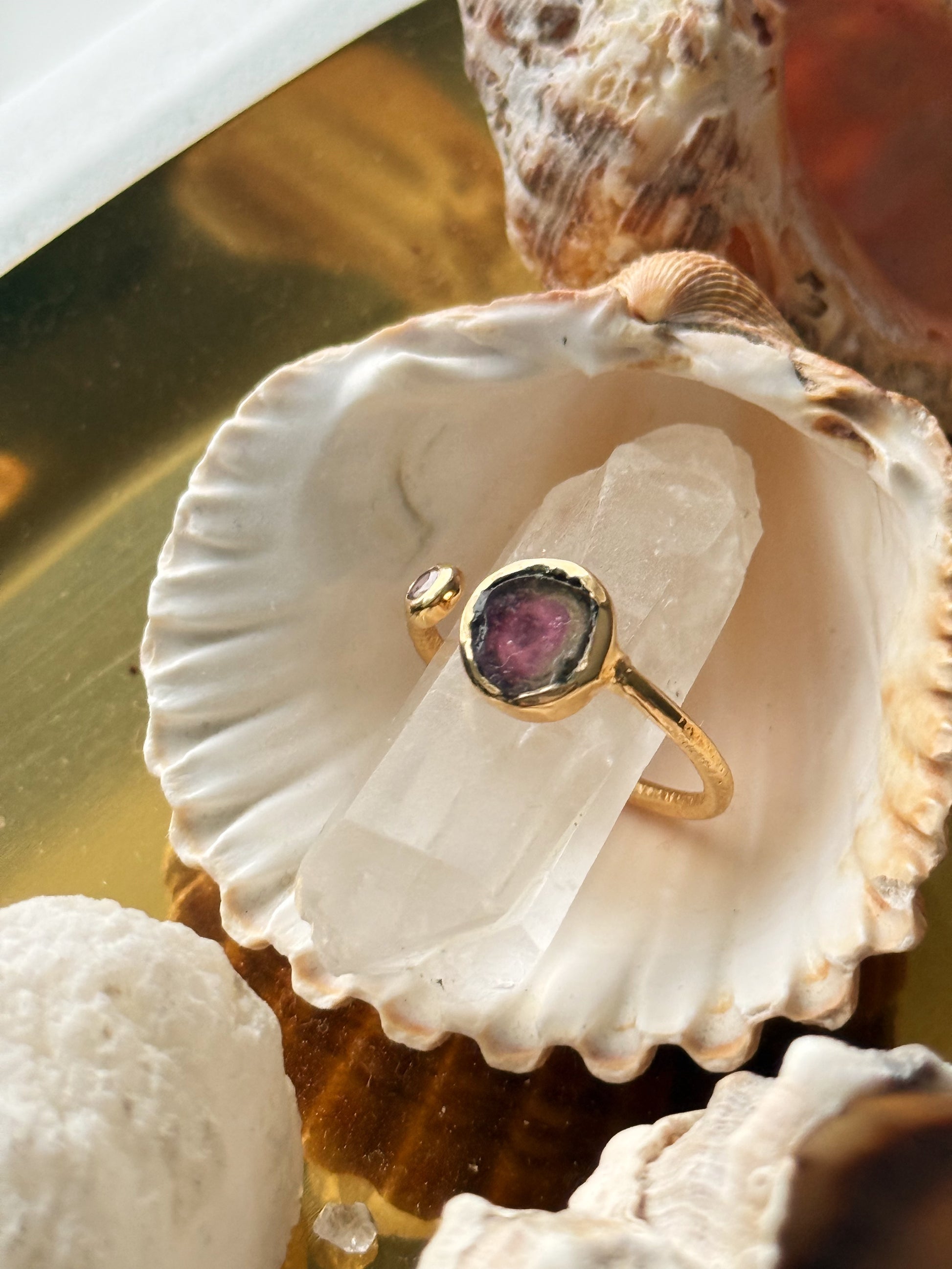 Vienetinis žiedas puoštas arbūzinio turmalino kristalu. Šis akmuo nuo seno žavėjo žmones dėl unikalaus spalvų derinio: žalios ir rožinės. Taip pat dėl stiprios energijos, jam būdingos magiškos savybės - keisti žmogaus gyvenimą į gerąją pusę, atverti širdies čakrą, pripildyti žmogaus gyvenimą meile ir džiaugsmu, subalansuoti ir įnešti harmonijos. Taip pat jis pritraukia netikėtą sėkmę ir gausą.